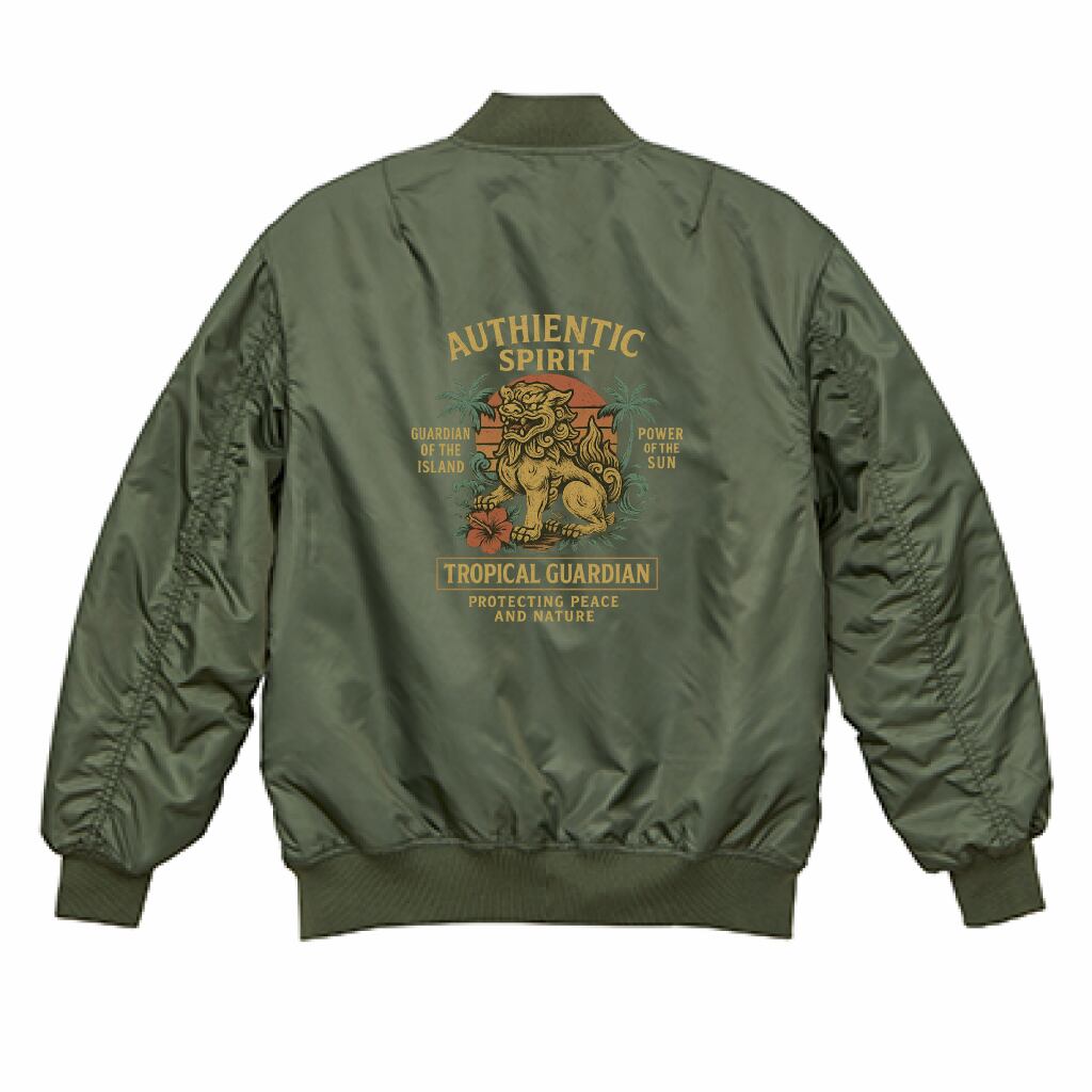 南国の守護獣・シーサーを中心に、“AUTHENTIC SPIRIT”“TROPICAL GUARDIAN” のメッセージを配した、存在感あふれるバックプリント MA-1 ジャケット。