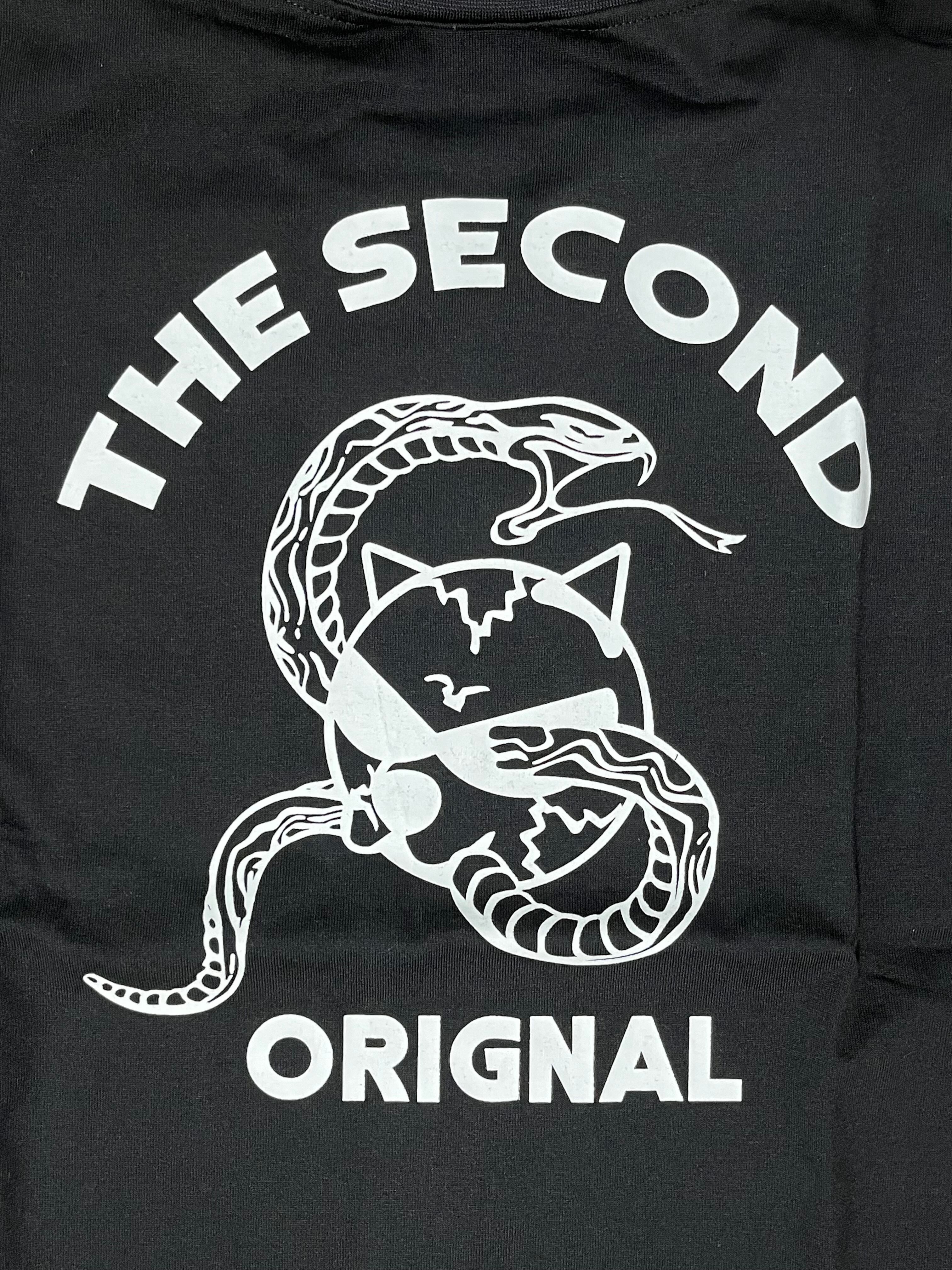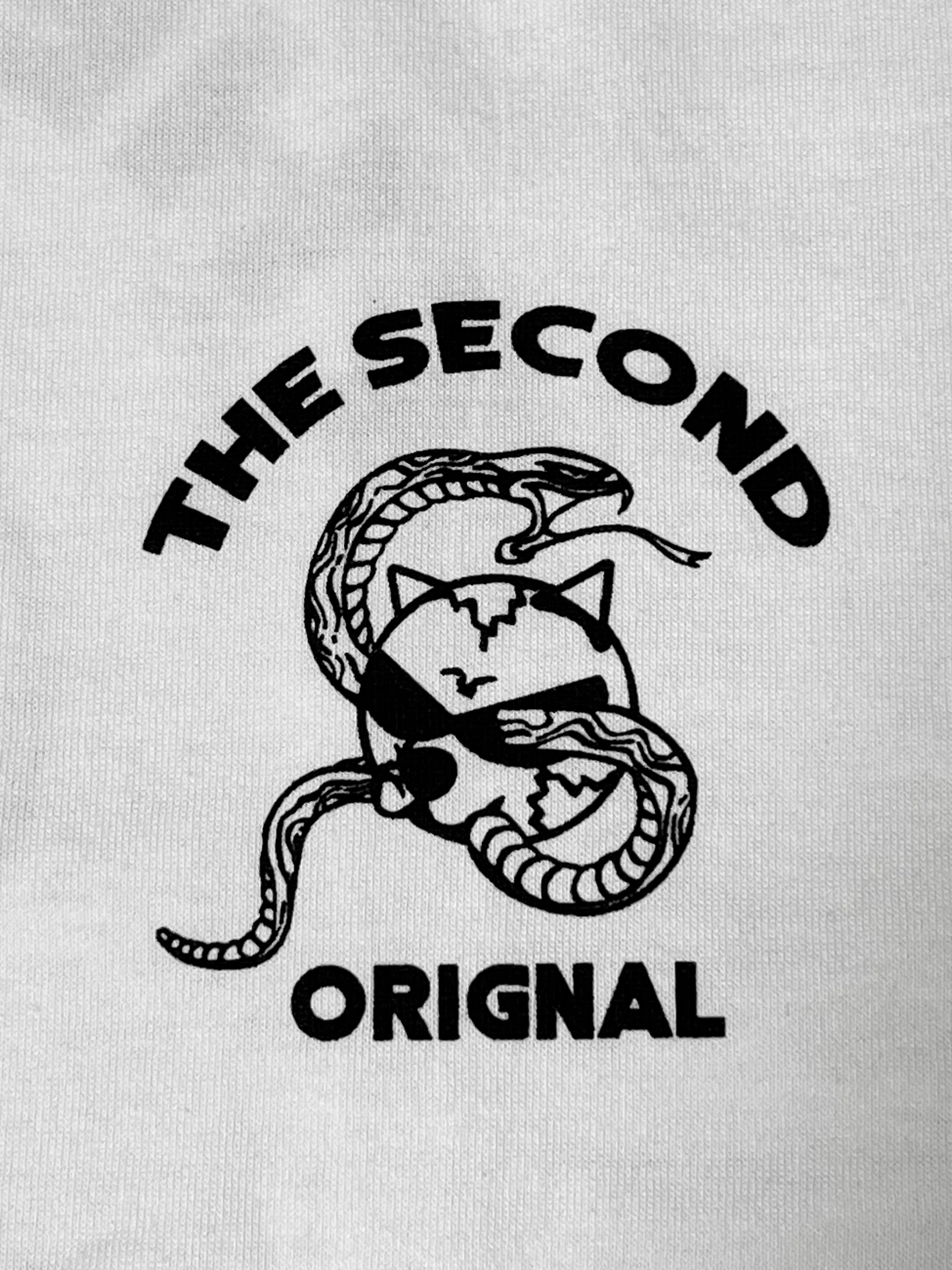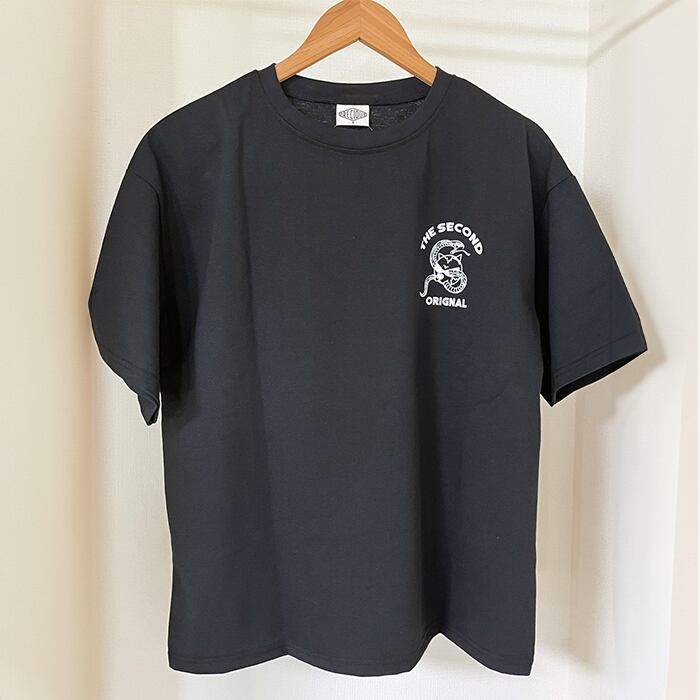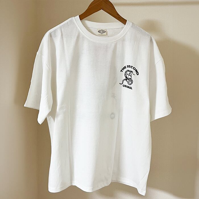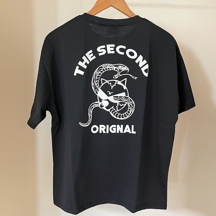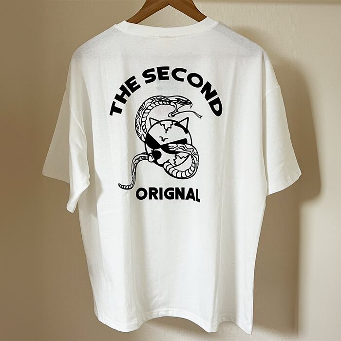 ビッグシルエット半袖Tシャツ。フロント左胸、バックに個性的な猫&ヘビプリント柄が目を引く一枚です。